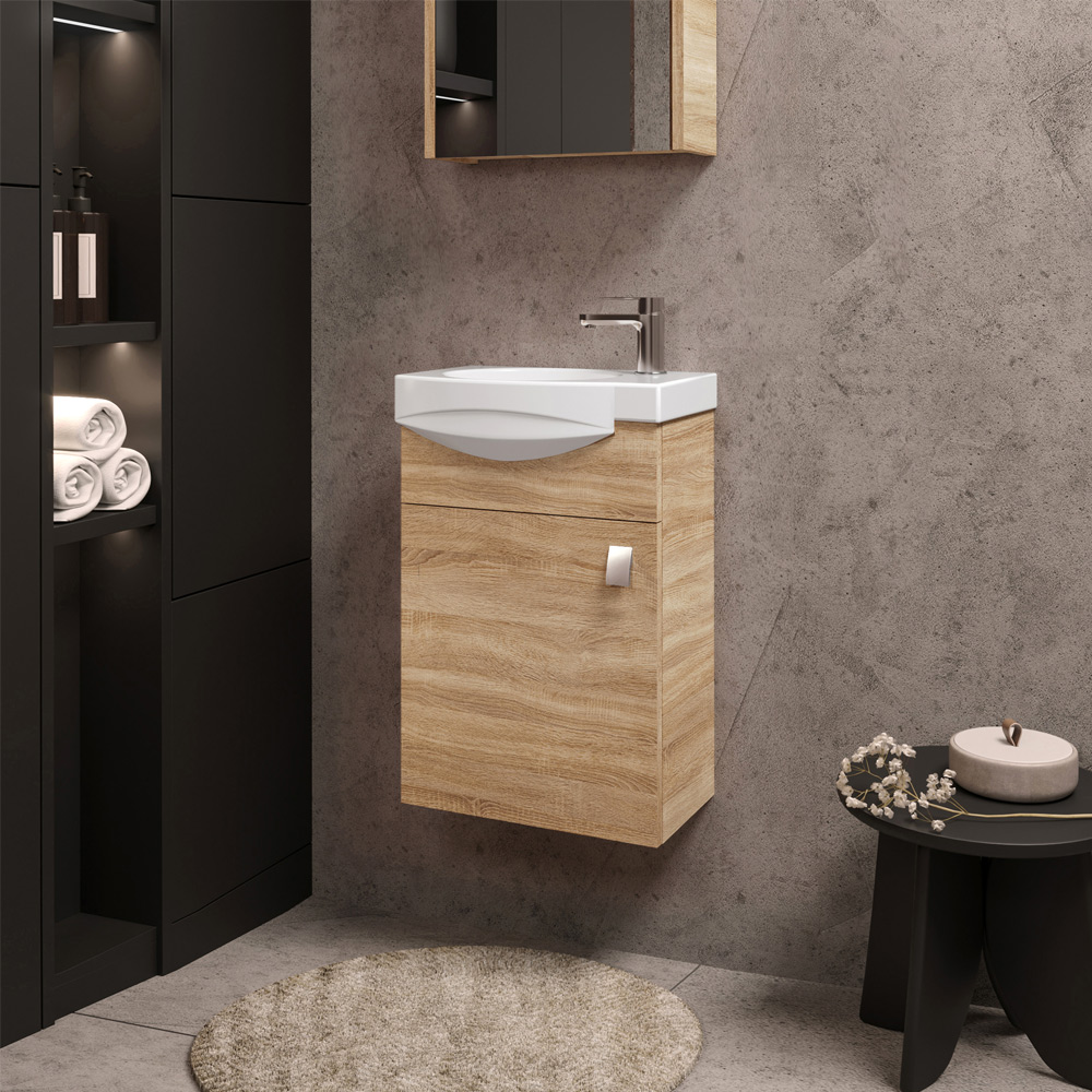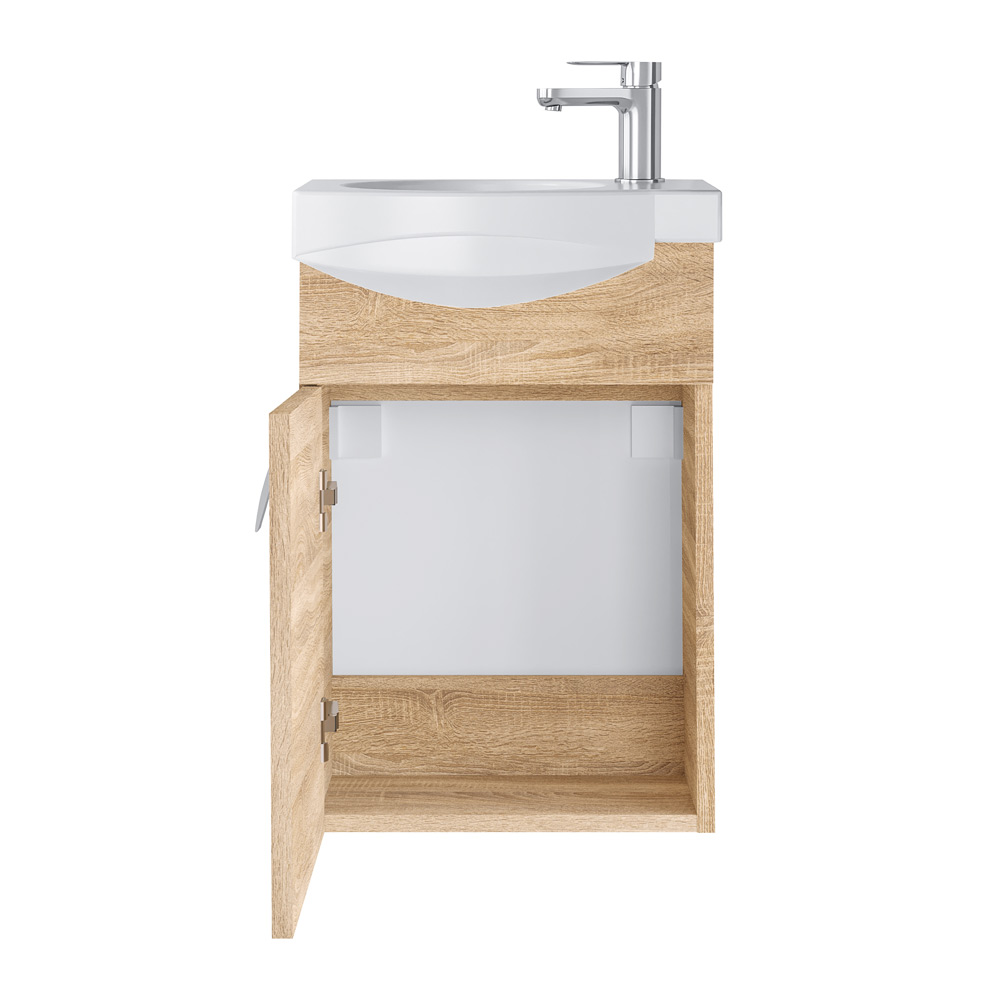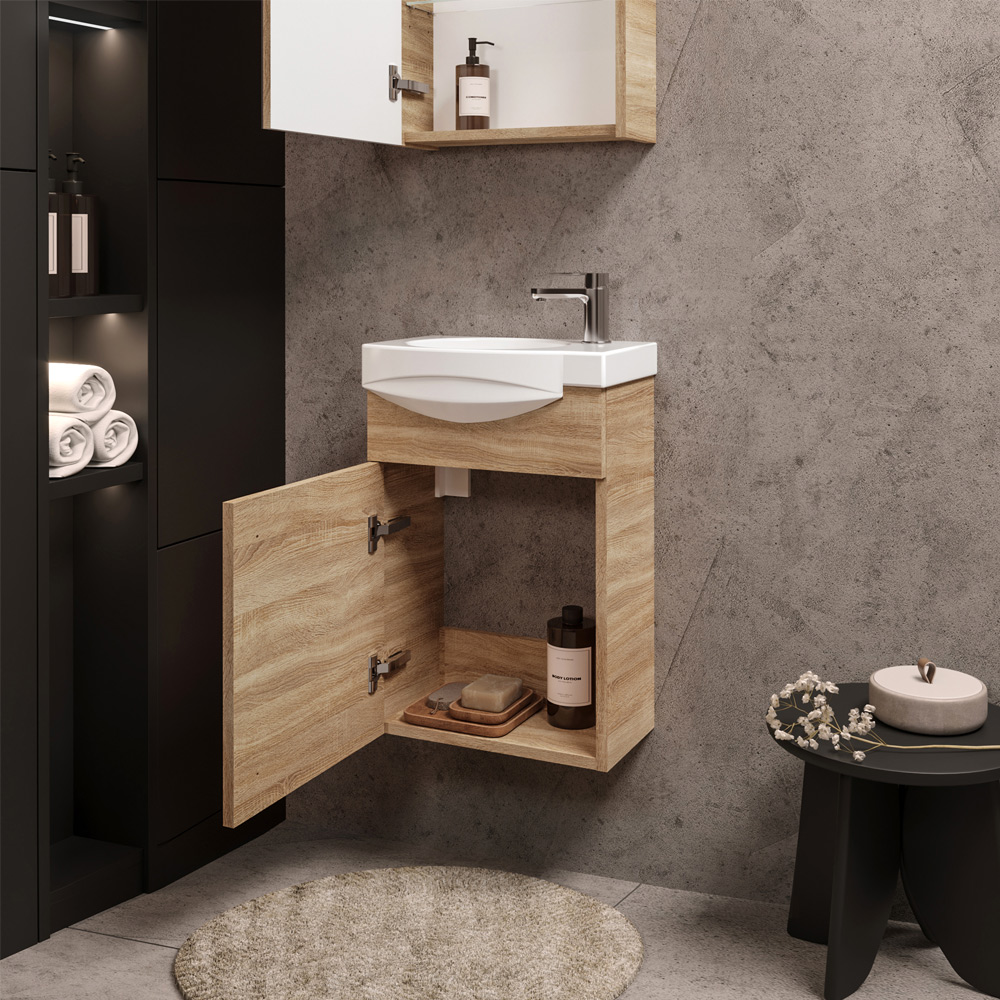 Spintelė nepriekaištingai dera su veidrodine spintele SV41-11 bei ūkinėmis spintelėmis UV32-11, UA32-11.
